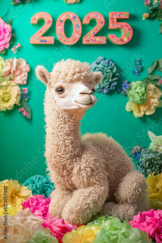 © Creative Valley, Fototapeta premium New Year Cards: 2025-themed Cute Neon Background Baby Came Illustrations