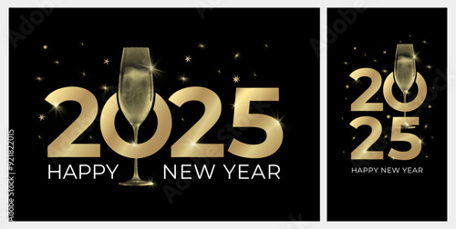 Fototapeta premium New Year 2025 cards. 2025 with glass of sparkling wine with halftone effect...