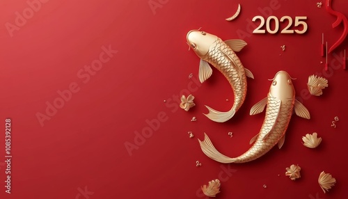 © sirirat, Obraz premium New year chinese style. luxury gold koi carp fish on red chinese background with copy space