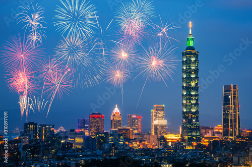 © TeTe Song, Obraz premium New Year colorful fireworks with cityscape taipei skyline in night time,Taiwan