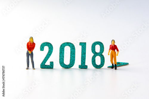 © Goodvibes Photo, Fototapeta premium 2018 New year concept man and woman miniature figures standing on 2 0 1 8 number with colorful stars on white background