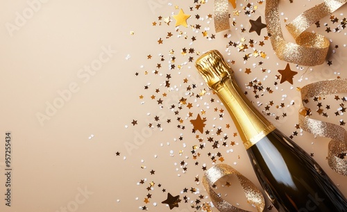 Fototapeta premium New Year concept with champagne, stars, and ribbons, high-resolution festive...