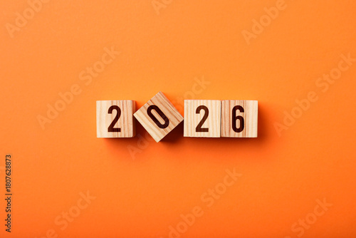 © New Africa, Obraz premium New 2026 year. Cubes with numbers on orange background, top view