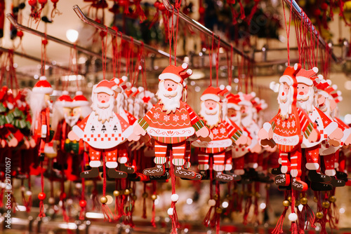© YarikL, Naklejka premium New year market. Set of holiday decorations and christmas tree toys hanging at new year trade fair shop window.