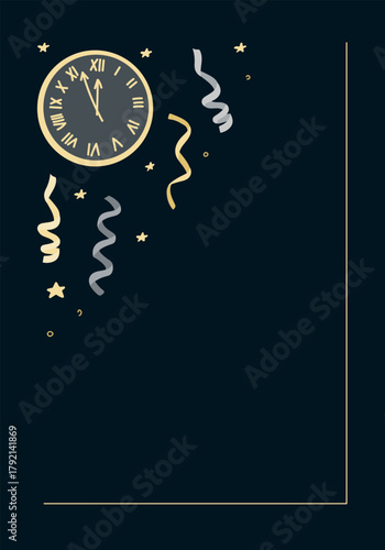 © Olena, Obraz premium New year midnight clock with gold streamers and stars on dark festive background. Hand drawn vector illustration symbolizing countdown, celebration and party invitation