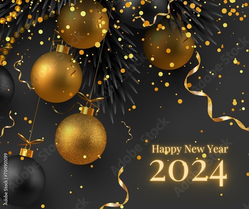© yaii, Naklejka premium 2024 New Year number. Golden digits and confetti over blue background.