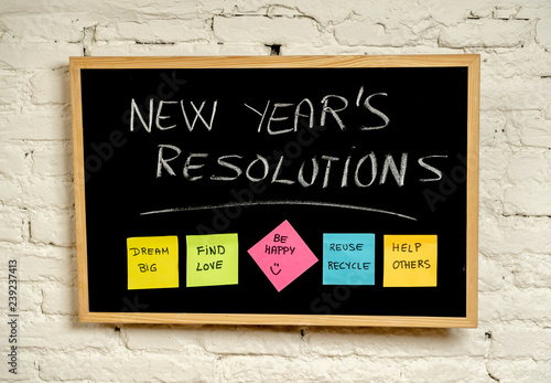 © SB Arts Media, Fototapeta premium New Year resolutions or popular Goals and colorful sticky post its notes on chalk blackboard