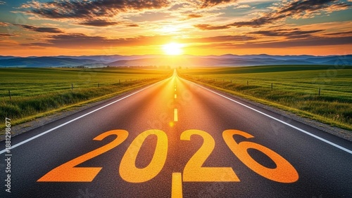 Obraz premium New year 2026 road ahead with beautiful sunset