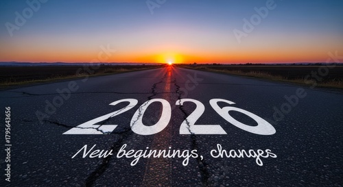 © Nima, Fototapeta premium New Year Road to Future - An open road leads to the horizon with a bright sunrise. The year 2026 represents new beginnings and positive changes ahead