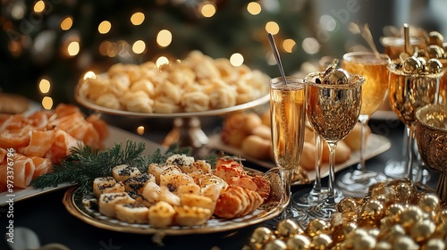 © Viacheslav, Naklejka premium New Year’s Eve party table with a variety of appetizers, cocktails, and a centerpiece of golden decorations, ready for the celebration. 4K hyperrealistic photo.