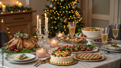 © Silaya Elena, Naklejka premium New Year's mood, fruits in a beautiful vase, night lights, New Year tree and a beautifully decorated table, high quality realistic photo