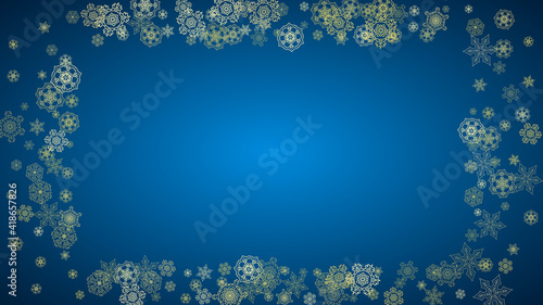 Fototapeta premium New Year snow on blue background. Gold glitter snowflakes. Christmas and New Year snow falling backdrop. For season sales, special offers, banner, cards, party invite, flyer. Horizontal frosty winter.