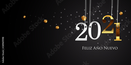 © detakstudio, Naklejka premium 2021 New Year Spanish greeting card (Feliz Año Nuevo 2021). Spanish 2021 New Year Version. Spanish 2021 Happy New Year background.