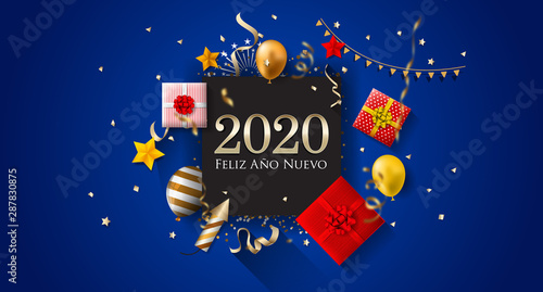 © detakstudio, Naklejka premium 2020 New Year Spanish greeting card (Feliz Año Nuevo 2020). Spanish 2020 New Year Version. Spanish 2020 Happy New Year background Version.