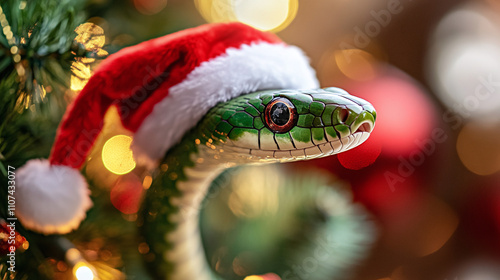 © Ruslan, Fototapeta premium 2025 New Year symbol green snake in Santa hat against Christmas tree background