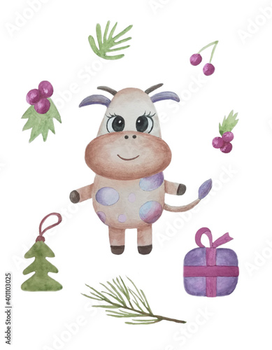 Naklejka premium New Year watercolor set of clipart with a bull. Drawn by hand.