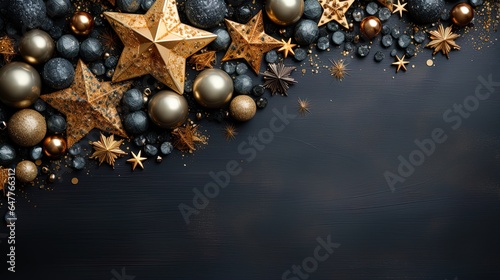 © Daniil, Naklejka premium New Years banner. Above view on a dark wood banner background. Copy space