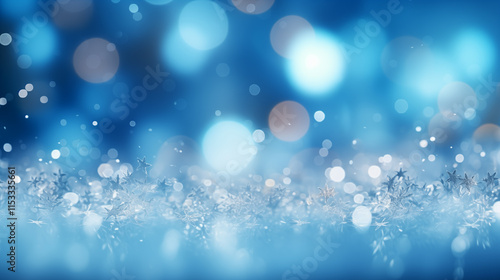 © Nanotrillion, Obraz premium New Years, Christmas chaotic blur bokeh of light snowflakes on background blue