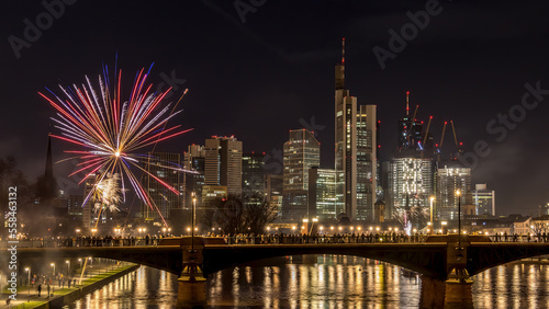 Naklejka premium New years eve with fireworks above the skyline of Frankfurt - Main at night...
