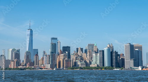 © stockyme, Fototapeta premium New York City day time view from Hudson river side with clear blue sky