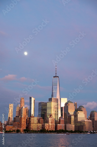 © Kenishirotie, Obraz premium New York city lower Manhattan skyline at twilight with moon