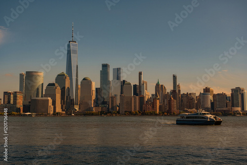 © Korneliia, Fototapeta premium New York City. One World Trade Center. WTC memorial. View from New Jersey. Skyline of World Trade Center. New York City downtown.