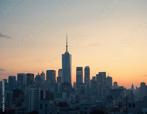 © Rizky, Naklejka premium New York City Skyline at Dusk with Warm Sunset Light