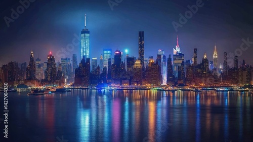 Fototapeta premium New York City skyline at night, illuminated by vibrant lights.