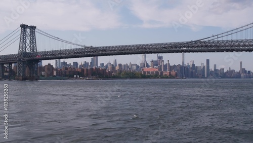 © Dogora Sun, Naklejka premium New York City skyline from ferry boat. Manhattan midtown highrise skyscrapers view from ferryboat. East river waterfront panorama, riverfront buildings architecture near water USA. Williamsburg Bridge