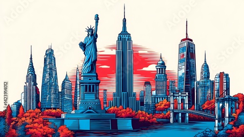 Fototapeta premium New York City skyline illustration featuring iconic landmarks.