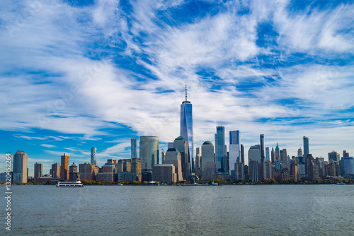 © Volodymyr, Fototapeta premium New York City skyline. NYC skyscrapers. Manhattan skyline. NY cityscape with clouds. Downtown New York buildings. NYC skyline, sky clouds. New York harbor view. Skyscrapers in Manhattan. NYC downtown.