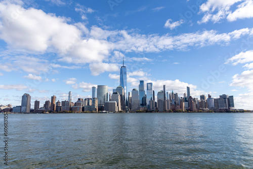 Fototapeta premium New York City skyline taken from New Jersey in a cold day of december. Sky is blue with few clouds. USA, NYC, NY, Manhattan