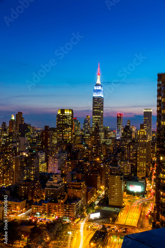 © f11photo, Obraz premium New York City skyline with urban skyscrapers at sunset.