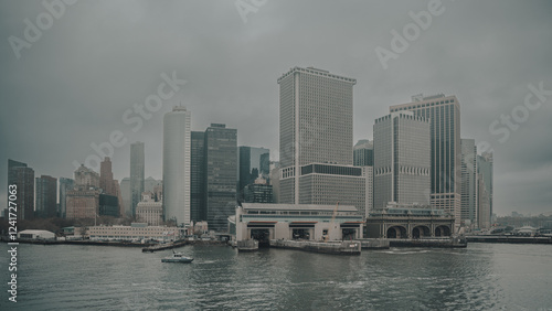 Fototapeta premium New York city view from Staten Island Ferry in a foggy day