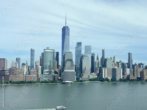 Obraz premium New York City Wall Street skyline in summer with a boat