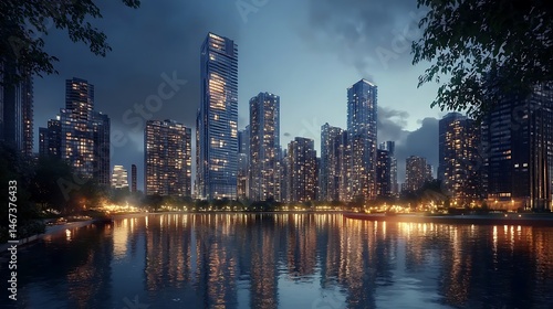 Naklejka premium New York Skyline at Twilight with Glowing Skyscrapers and Lights High...
