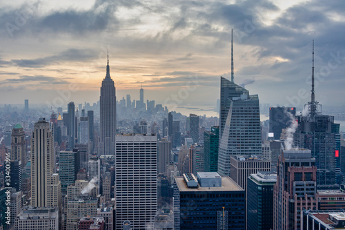 © Mohamed, Fototapeta premium New York skyline from the top of Top of the Rock (Rockefeller Center)sunset view in Winter with clouds in the sky