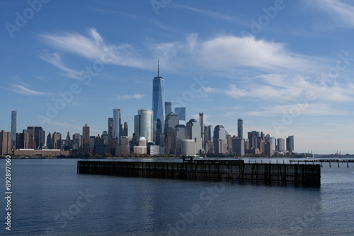 © Volodymyr, Naklejka premium New York, United States. New York city skyline in Midtown Manhattan. USA, NYC, NY, Manhattan. American big city. Lower Manhattan skyline. New York from New Jersey. Downtown Manhattan with blue sky.