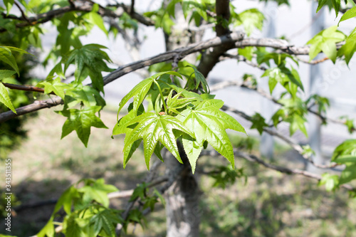 © AnastasiaStark, Obraz premium New young maple tree leaves grow on a plant branch in spring