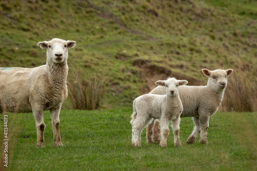 © fotoliasc2014, Obraz premium New Zealand farming scene, sheep and lambs, spring, Pouawa, near Gisborne, East Coast, North Island
