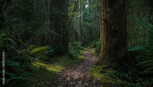 Obraz premium New Zealand rainforest pathway, highlighting seasonal change and...