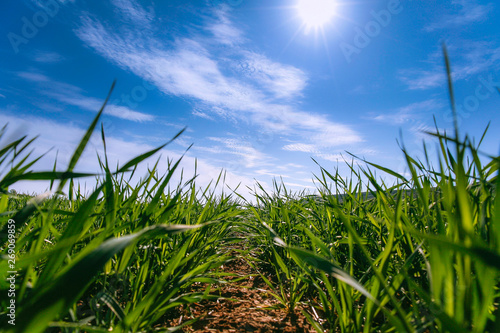 Fototapeta premium newborn barley field seen from below with the sun in front and the blue sky