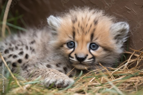 Obraz premium newborn cheetah lying in the grass, its spotted fur visible, created with...