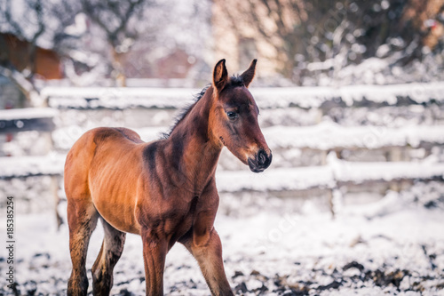 Fototapeta premium Newborn colt walking outdoors in winter