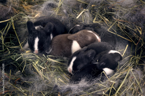 Naklejka premium Newborn Dwarf Dutch rabbits in the nest of dry grass and down.