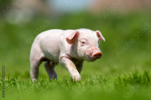 © byrdyak, Fototapeta premium Newborn piglet on spring green grass