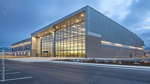 Obraz premium Newly constructed industrial storehouse with spacious interior, clean lines, and large windows, emphasizing modern architecture and functionality