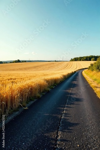 © chaikrit, Naklejka premium Newly paved blacktop beside a golden wheat field, lines, surface