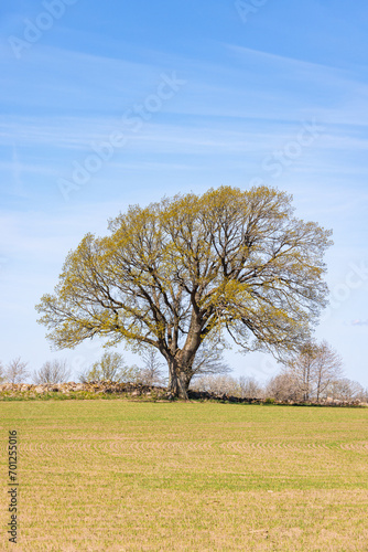 © Lars Johansson, Fototapeta premium Newly sown field with a budding solitary tree