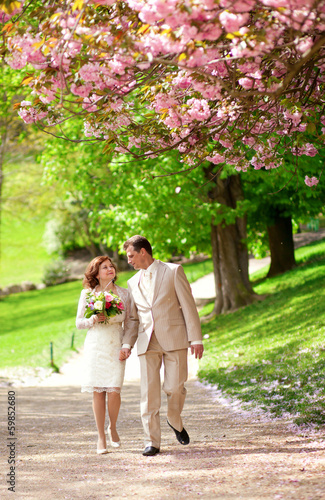 Fototapeta premium Newlywed couple having a stroll in park at spring